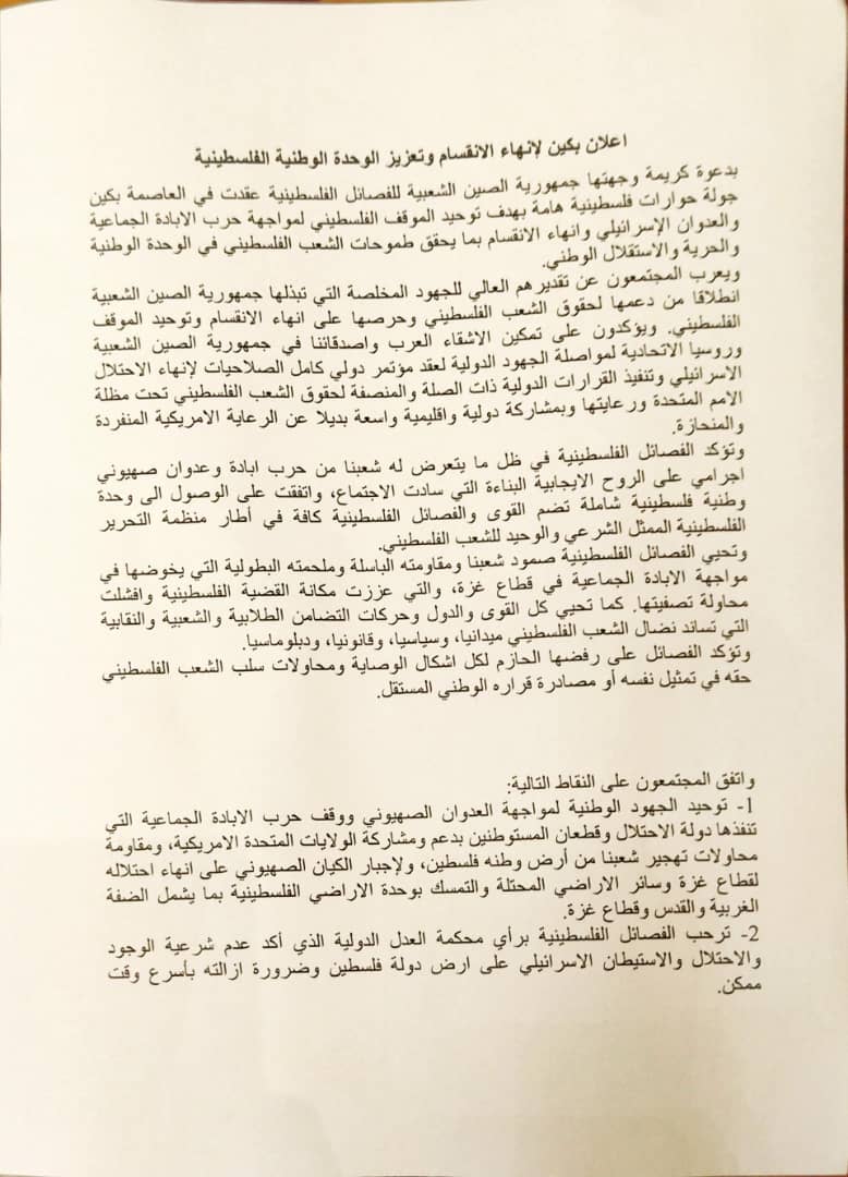 وفيما يلي إعلان بكين لإنهاء الانقسام وتعزيز الوحدة الوطنية الفلسطينية