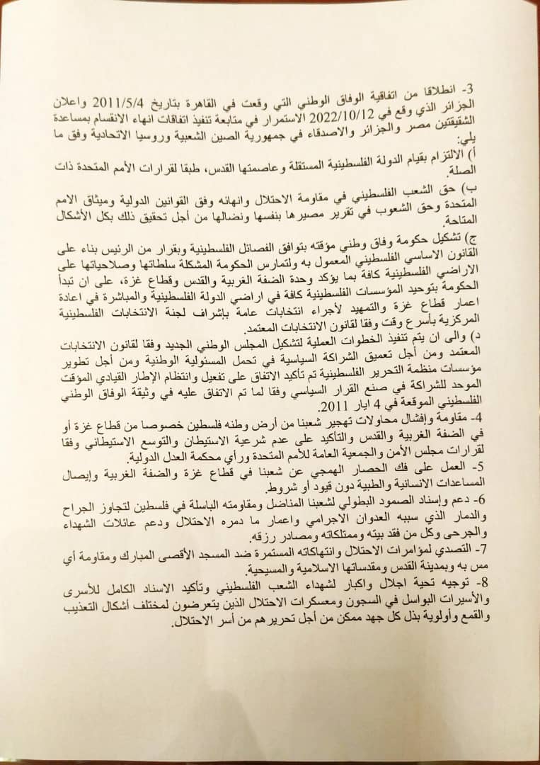 3- انطلاقا من اتفاقية الوفاق الوطني التي وقعت في القاهرة بتاريخ 4/5/2011 إعلان الجزائر الذي وقع في 12/10/2022 الاستمرار في متابعة تنفيذ اتفاقيات إنهاء الانقسام بمساعدة الشقيقتين مصر والجزائر والاصدقاء في جمهورية الصين الشعبية وروسيا الاتحادية وفق ما يلي: