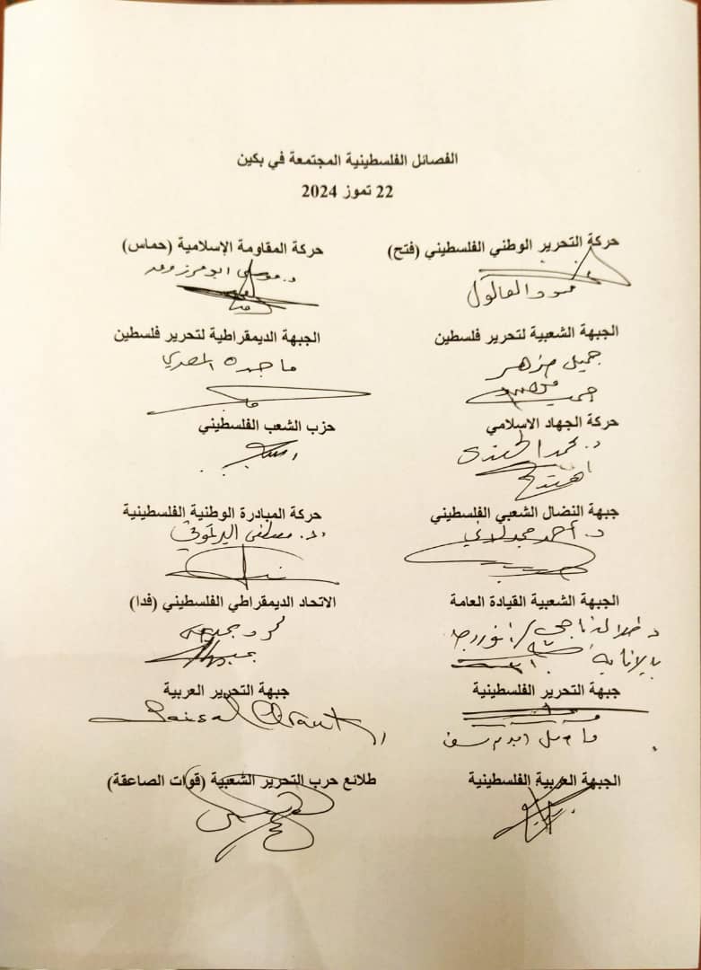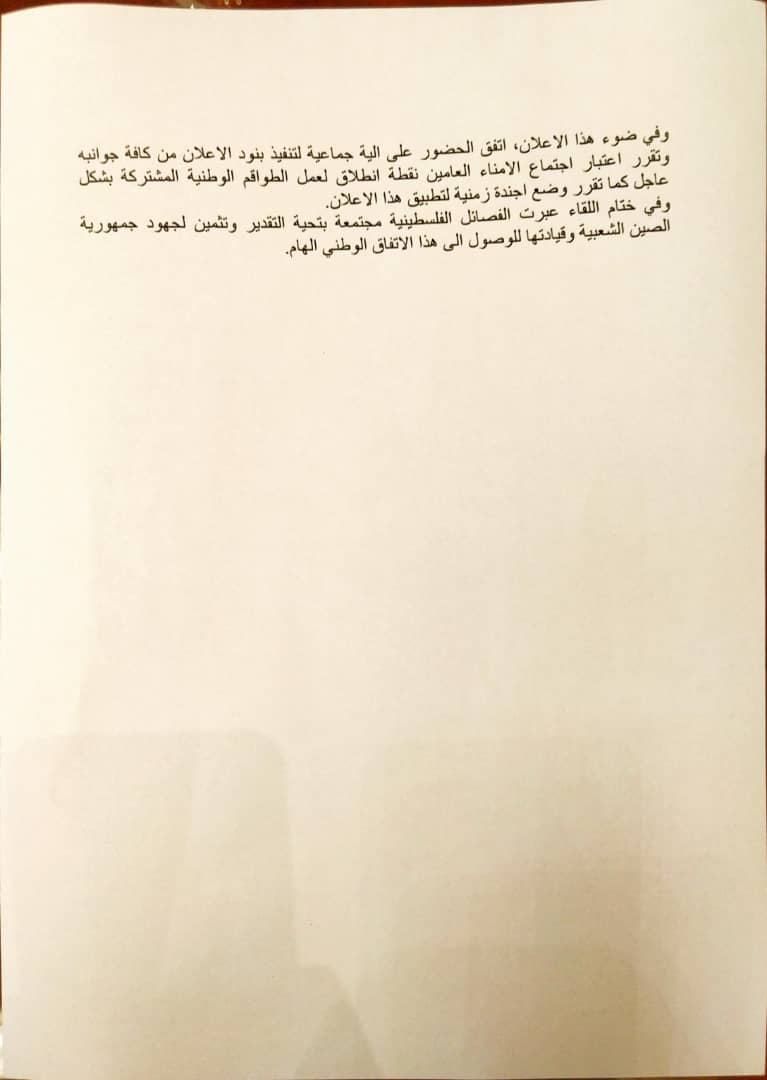 وفي ختام اللقاء عبرت الفصائل الفلسطينية مجتمعة بتحية التقدير وتثمين لجهود جمهورية الصين الشعبية وقيادتها للوصول الى هذا الاتفاق الوطني الهام.