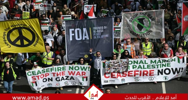 وطالبوا، الحكومة البريطانية بوقف تراخيص تصدير الأسلحة لإسرائيل، ورددوا هتافات تطالب بالحرية لفلسطين وبإنهاء الحرب الإسرائيلية على غزة.